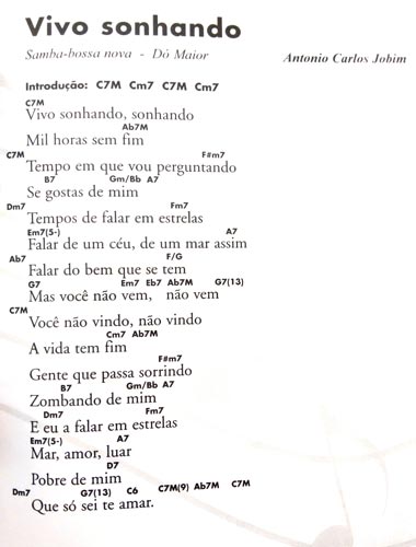 Coletânea de 300 canções com letras e cifras para violão, entre elas: A noite do meu bem, A Rita, Açaí, Águas de março, Alegria alegria, Aquarela do Brasil, Aquele abraço, Baila comigo, Berimbau, Bodas de prata, Bom dia tristeza, Brincar de viver, Brigas nunca mais, Caçador de mim, Caminhemos, Canta Brasil, Carinhoso, Casinha branca, Com que roupa, Cotidiano, Conceição, Coração leviano, Dindi, Dois pra lá, dois pra cá, Duas contas, Eu e a brisa, Garota de Ipanema, Favela, Feitiço da Vila, Força estranha, Gente humilde, Lígia, Marina, Meu bem querer, Não tenho lágrimas, O barquinho, O morro não tem vez, O trem das sete, Olhos nos olhos, Opinião, Pastorinhas, Pérola negra, Primavera, Quem te viu, quem te vê, Regra três, Rio, Rosa, Saudosa maloca, Se acaso você chegasse, Serra da Boa Esperança, Tarde em Itapuã, Travessia, Último desejo, Vingança e muito mais.