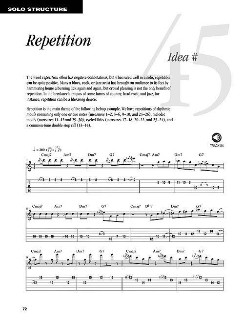 This book with online audio explores all the main components necessary for crafting well-balanced rhythmic and melodic phrases. It also explains how these phrases are put together to form cohesive solos. Many styles are covered – rock, blues, jazz, fusion, country, Latin, funk and more – and all of the concepts are backed up with musical examples. The 50 ideas are divided into five main sections: The Basics – covers fundamental but all too often forgotten techniques, such as slurs and vibrato, that can breathe new life into your phrases; Melodic Concepts – explores various aspects of melodic phrasing, such as motifs, chromaticism and sequences; Harmonic Embellishments – discusses the melodic potential of harmonic intervals (dyads), chords and chord partials; Rhythmic Concepts – explores various aspects of rhythmic phrasing, such as accents, free-time phrasing and metric modulation, and how it pertains to melodic soloing; Solo Structure – all of the topics discussed in the book come together to help form the big picture. The companion audio contains 89 demos for listening, and most tracks feature full-band backing. The audio is accessed online using the unique code inside each book and can be streamed or downloaded. The audio files include PLAYBACK+, a multi-functional audio player that allows you to slow down audio without changing pitch, set loop points, change keys, and pan left or right.