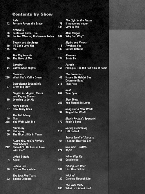 Esta série traz uma detalhada visão do repertório musical do teatro contemporâneo dos anos 80 até os dias de hoje. Inclui entre 35 e 40 canções em cada volume (algumas delas foram editadas aqui pela primeira vez) e mostram o que há de mais representativo em musicais da Broadway, Off-Broadway e London shows. Neste volume você econtrará: Avenue Q, The Boy from Oz, Les Miserables, Miss Saigon, Rent, Titanic.