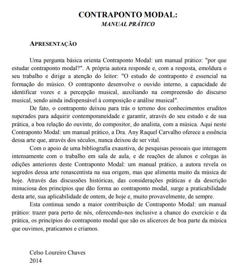 Em um tempo em que se retorna a tempos passados para fazê-los nossos ainda uma vez, o contraponto vai deixando o terreno dos conhecimentos altamente eruditos para integrar aquele conjunto de saberes que garantem a boa relação do ouvinte, do compositor, do analista, com a música. Aqui neste Contraponto Modal: um manual prático, a Dra. Any Raquel Carvalho oferece a essência dessa arte rediviva.