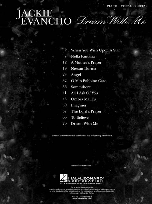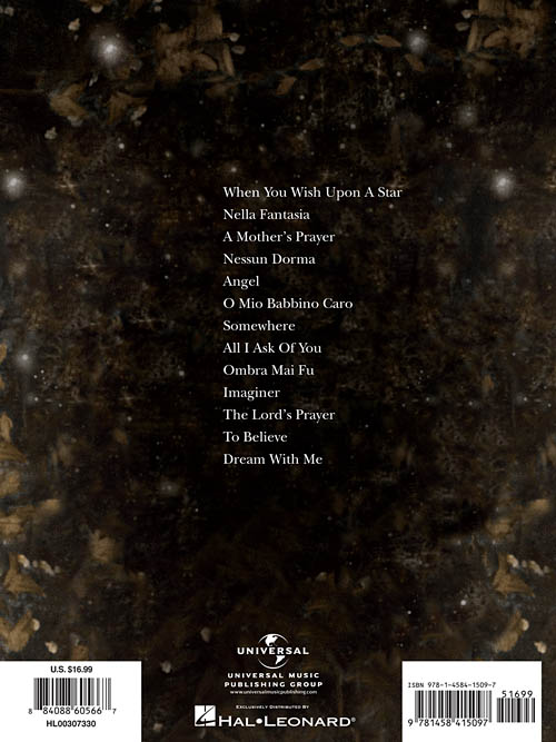 Transcrições para piano/voz e acordes para violão; incluindo: All I Ask of You • Angel • Imaginer • The Lord's Prayer • A Mother's Prayer • Nella Fantasia • Nessun Dorma • O Mio Babbino Caro • Ombra Mai Fu • Somewhere • To Believe • When You Wish upon a Star.