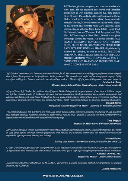 Jazz Lines é um livro de 20 solos escritos sobre grandes standards de jazz - Body and Soul, Night and Day, I Can’t Get Started, April in Paris, entre outros. Destinado a todos instrumentos, com partes em clave de sol, clave de fá, transpostas para sopros Eb e Bb, além de comping simples na mão direita para piano com walking bass. Apresenta também análise estrutural de cada tema, e análise linear das frases escolhidas. Excelente ferramenta para estudar jazz, incrementar suas ferramentas harmônicas e estudar improvisos.