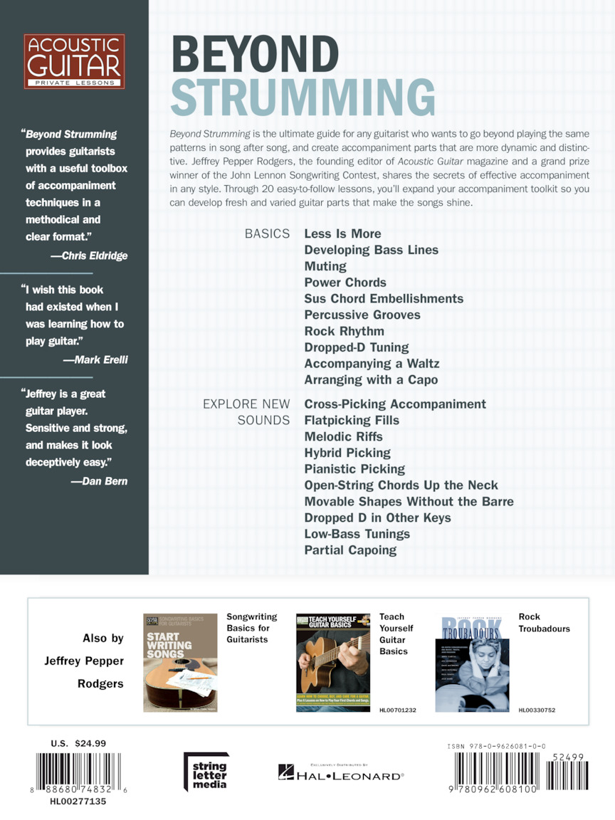 Learn to create dynamic accompaniment parts in any setting with this ultimate guide for any guitarist who wants to go beyond playing the same patterns in song after song. Author Jeffrey Pepper Rodgers shares the secrets of effective accompaniment in any style. Through twenty easy-to-follow lessons, you'll learn to: deepen your grooves, discover new chord shapes and picking styles; explore alternate tunings and partial capos; and more. With this book and its downloadable video files, you will expand your toolkit and develop fresh and varied guitar parts to make songs shine!