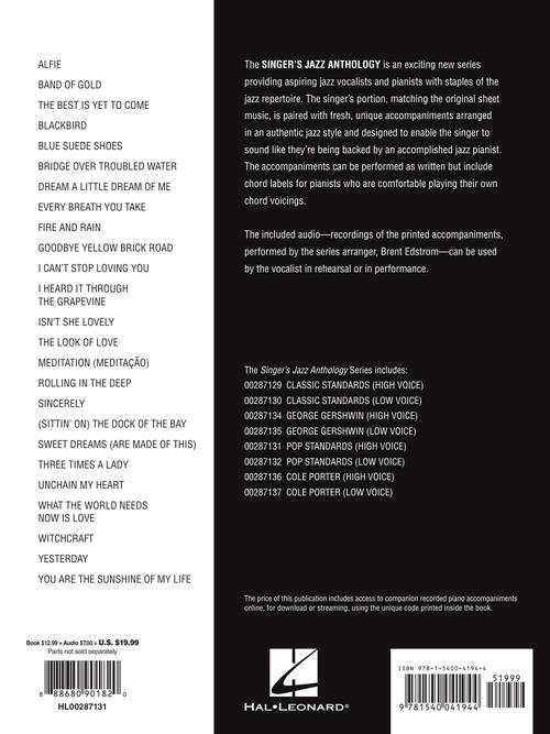 The Singer's Jazz Anthology is an exciting new series providing aspiring jazz vocalists and pianists with staples of the jazz repertoire. The singer's portion, matching the original sheet music, is paired with fresh, unique accompaniments arranged in an authentic jazz style and designed to enable the singer to sound like they're being backed by an accomplished jazz pianist. The accompaniments can be performed as written but include chord labels for pianists who are comfortable playing their own chord voicings. This book also includes access to recordings of the series arranger, Brent Edstrom, playing the piano accompaniments for use in rehearsal or performance. This edition features 25 must-know pop standards, including: Alfie · Blackbird · Bridge over Troubled Water · Dream a Little Dream of Me · Every Breath You Take · Fire and Rain · Goodbye Yellow Brick Road · Isn't She Lovely · Rolling in the Deep · (Sittin' On) The Dock of the Bay · Three Times a Lady · What the World Needs Now Is Love · Yesterday · and more.