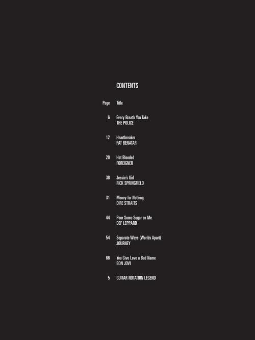 A série Guitar Play-Along vai ajudá-lo a tocar as suas canções favoritas de forma rápida e fácil. Basta seguir a partitura ou a tablatura, ouvir o áudio para sentir como soa o som da guitarra e depois tocar junto utilizando a faixa de play-back. As faixas de áudio estão disponíveis online, juntamente com um player digital multifuncional (Playback+), que permite alterar o andamento sem alterar o tom, definir pontos específicos para tocar (loop), alterar o tom, além de balanço direita/esquerda. A melodia e a letra também estão escritas caso você queira cantar. Every Breath You Take • Heartbreaker • Hot Blooded • Jessie's Girl • Money for Nothing • Pour Some Sugar on Me • Separate Ways (Worlds Apart) • You Give Love a Bad Name.