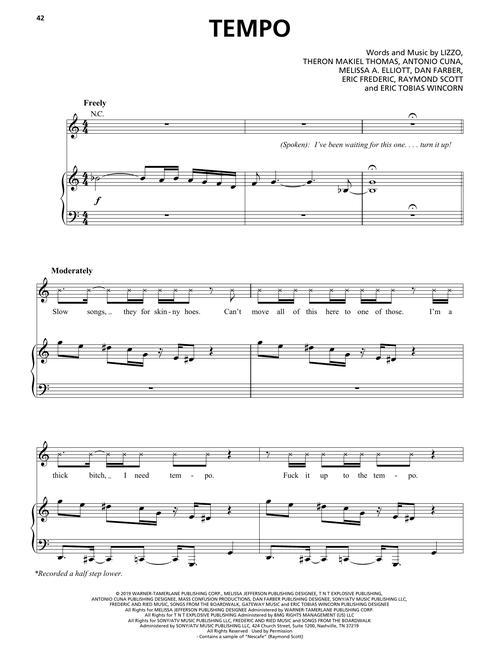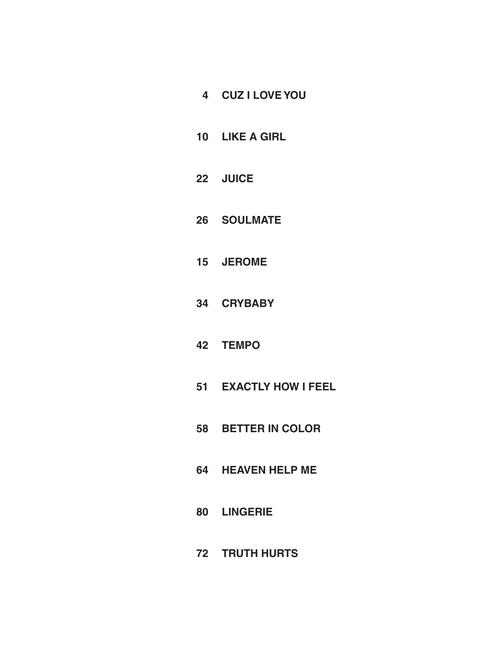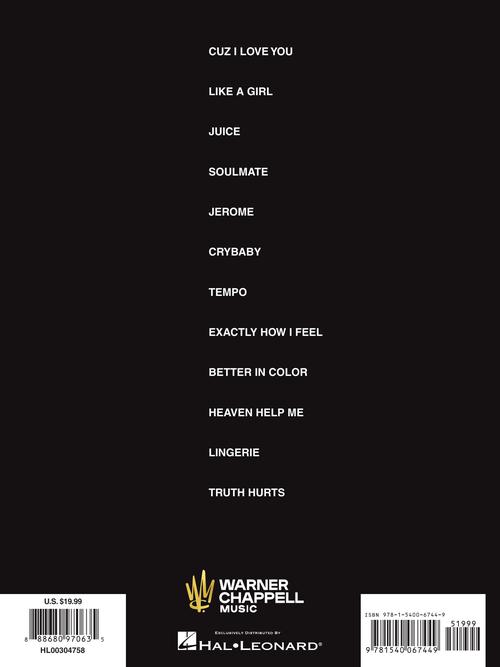 Uma dúzia de músicas do álbum inovador de 2019 deste cantor, compositor, rapper, atriz e flautista. Este fólio correspondente inclui arranjos de piano / vocal / guitarra das músicas: Better in Color · Crybaby · Cuz I Love You · Exactly How I Feel · Heaven Help Me · Jerome · Juice · Like a Girl · Lingerie · Soulmate · Tempo · Truth Hurts.