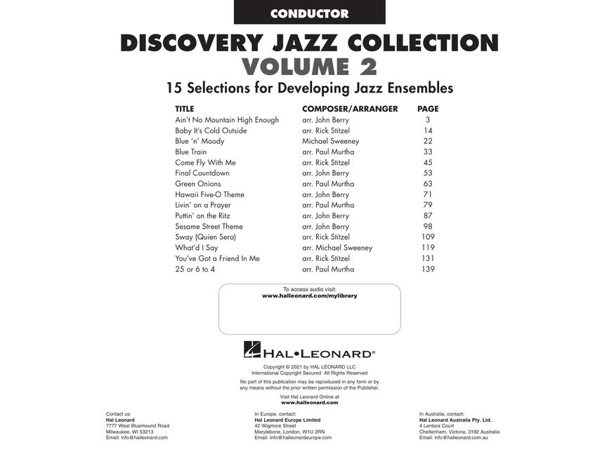 Here is an economical collection of 15 complete arrangements in a variety of styles. Perfect for quickly building a library of great sounding charts. Includes: Ain't No Mountain High Enough; Baby, It's Cold Outside; Blue 'n' Moody; Blue Train; Come Fly with Me; Final Countdown; Green Onions; Hawaii Five-O Theme; Livin' on a Prayer; Puttin' on the Ritz; Sesame Street Theme; Sway (Quien Sera); 25 or 6 to 4; What'd I Say; and You've Got a Friend in Me. Audio is accessed online using the unique code inside the book and can be streamed or downloaded. The audio files include PLAYBACK+, a multi-functional audio player that allows you to slow down audio without changing pitch, set loop points, change keys, and pan left or right.