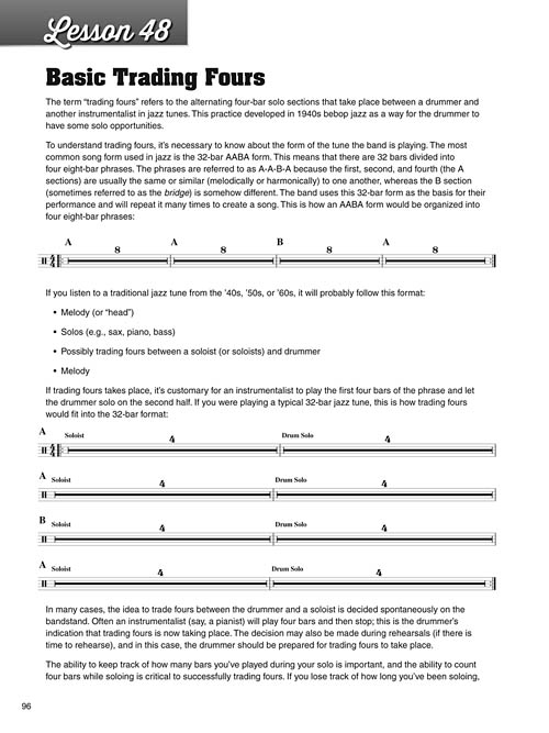 100 Essential Drumset Lessons contains information, examples, exercises, and over 300 demonstration and play-along audio tracks covering a range of topics that every drummer – from novice to professional – will find useful. Its educational scope runs the gamut, including basic rock, funk, metal, hip-hop, blues, country, basic swing, advanced swing concepts, fills, technical exercises, metric superimposition, soloing concepts, odd time playing, brush playing, as well as Afro-Cuban, Brazilian, and other world music drumming styles. It also includes advice on productive practicing techniques, transcribing drum parts, creating an original drum part for a song, and five drumset audition solos – suitable for use at all-state auditions, music festivals, or recitals.