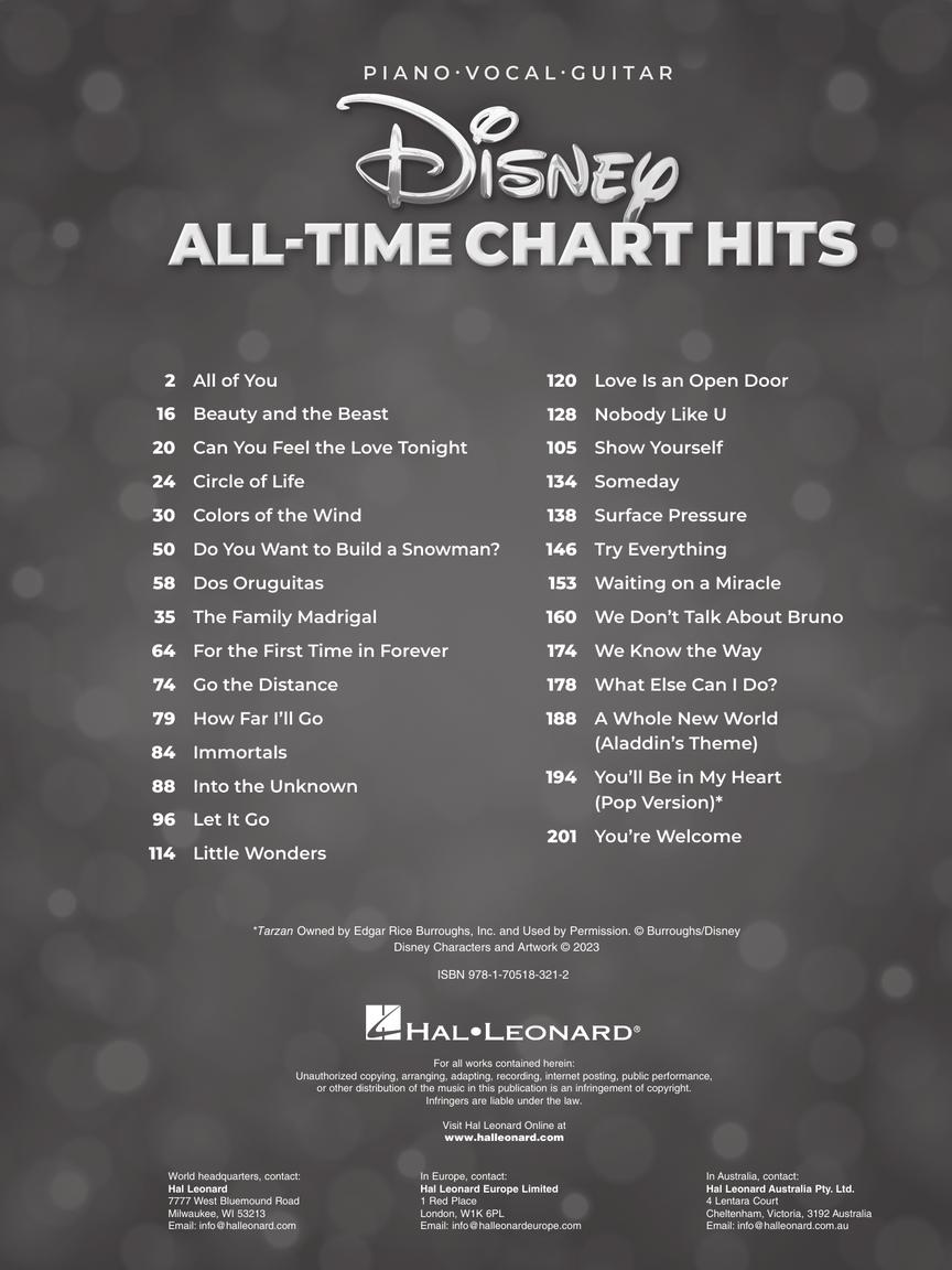 This beautiful collection includes 28 of Disney's biggest-ever hits from the Billboard Hot 100 charts, from Aladdin and The Lion King to Frozen and Encanto! Songs include: Beauty and the Beast • Can You Feel the Love Tonight • Colors of the Wind • For the First Time in Forever • How Far I'll Go • Into the Unknown • Let It Go • Love Is an Open Door • We Don't Talk About Bruno • A Whole New World (Aladdin's Theme) • You'll Be in My Heart (Pop Version) • You're Welcome • and more!