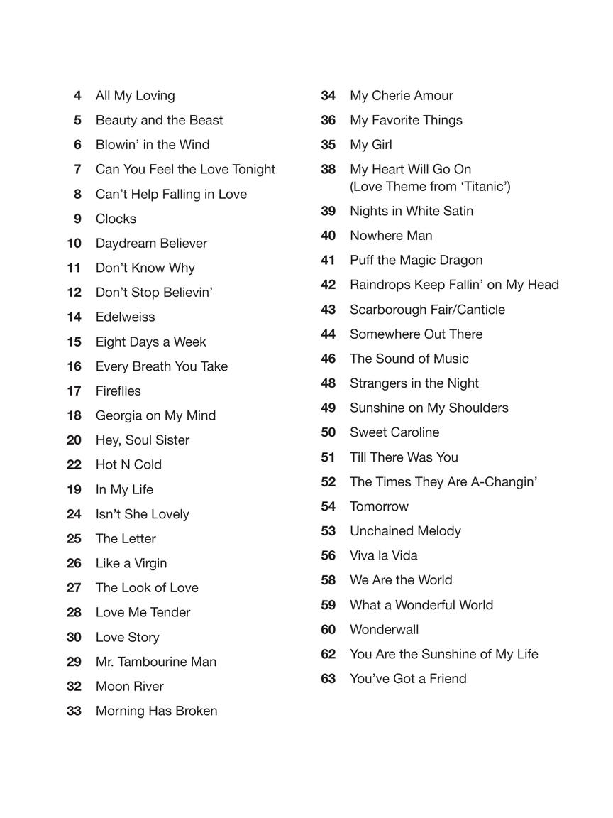 Toque 50 das suas músicas pop favoritas no seu instrumento de escolha! Esta coleção apresenta arranjos escritos em tons e intervalos acessíveis com letras e símbolos de acordes. As músicas incluem: All My Loving • Blowin' in the Wind • Clocks • Don't Stop Believin' • Every Breath You Take • Fireflies • Hey, Soul Sister • In My Life • Love Story • My Girl • Nights in White Satin • Sweet Caroline • Unchained Melody • Viva La Vida • What a Wonderful World • You've Got a Friend • e outras.