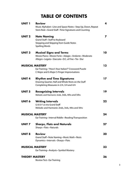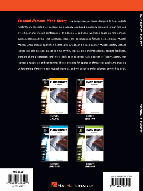 Essential Elements Piano Theory is a comprehensive course designed to help students master theory concepts. New concepts are gradually introduced in a clearly presented format, followed by sufficient and effective reinforcement. Each book features three sections of “Musical Mastery” which include ear training, mastery in rhythm, symbols, reading, and analysis. Students learn to apply their theoretical knowledge in a musical context through such elements as improvisation, transposition, reading lead lines and standard chord progressions. Each book concludes with a section of “Theory Mastery” which includes a review test and ear training. The creative and fun approach of this series applies the student's understanding of theory to real musical examples, and will enhance and supplement any method book. (NOTE: Books 1 and 2 correspond directly with the Texas Theory State Test.)