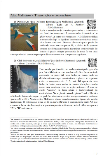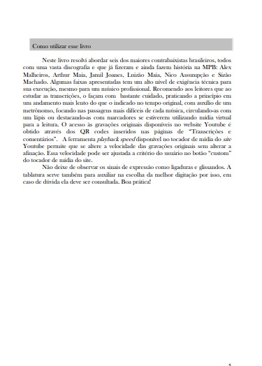 Neste livro resolvi abordar seis dos maiores contrabaixistas brasileiros, todos com uma vasta discografia e que já fizeram e ainda fazem história na MPB: Alex Malheiros, Arthur Maia, Jamil Joanes, Luizão Maia, Nico Assumpção e Sizão Machado. Algumas faixas apresentadas tem um alto nível de exigência técnica para sua execução, mesmo para um músico profissional. Recomendo aos leitores que ao estudar as transcrições, o façam com bastante cuidado, praticando a princípio em um andamento mais lento do que o indicado no tempo original, com auxílio de um metrônomo, focando nas passagens mais difíceis de cada música, circulando-as com um lápis ou destacando-as com marcadores se estiverem utilizando mídia virtual para a leitura. O acesso ás gravações originais disponíveis no website Youtube é obtido através dos QR codes inseridos nas páginas de “Transcrições e comentários”. A ferramenta playback speed disponível no tocador de mídia do site Youtube permite que se altere a velocidade das gravações originais sem alterar a afinação. Essa velocidade pode ser ajustada a critério do usuário no botão “custom” do tocador de mídia do site. Não deixe de observar os sinais de expresão como ligaduras e glissandos. A tablatura serve também para auxiliar na escolha da melhor digitação por isso, em caso de dúvida ela deve ser consultada. Boa prática!
