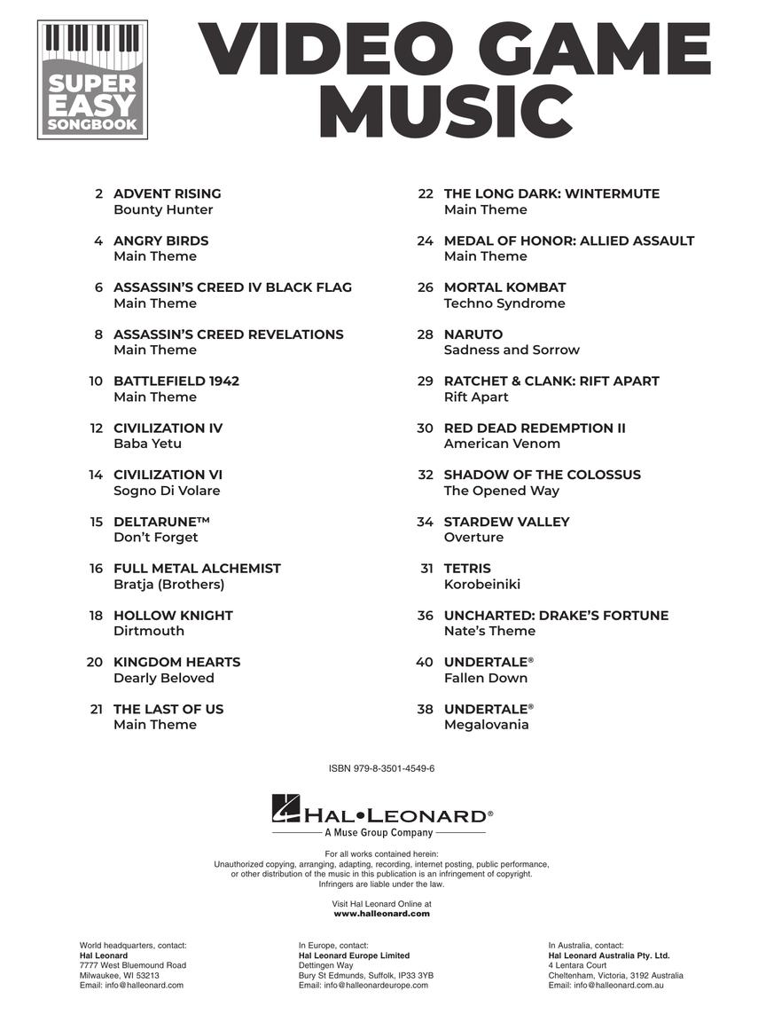 Arranjos superfacilitados para piano/teclado. Melodia simples na mão direita, com os nomes das notas na partitura e acordes básicos para mão esquerda. Incluindo: American Venom (from RED DEAD REDEMPTION II) • Assassin's Creed Revelations (from ASSASSIN'S CREED) • Bounty Hunter (from ADVENT RISING) • Dirtmouth (from HOLLOW KNIGHT) • The Last Of Us (from THE LAST OF US) • e outras!!!