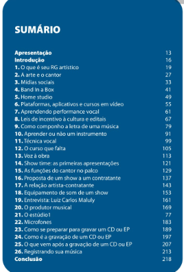 Afinal , como emocionar a plateia ? O que é o seu RG Artístico? Como se faz uma proposta de show para uma casa de show? Como compor uma letra de música ? Como é o processo de gravação num estúdio ? Como se escolhe um produtor musical? Como funcionam as Leis de incentivo a cultura ? E as plataformas digitais e as mídias sociais ? Como registrar a sua música? Por que devo ter um home studio ? etc
