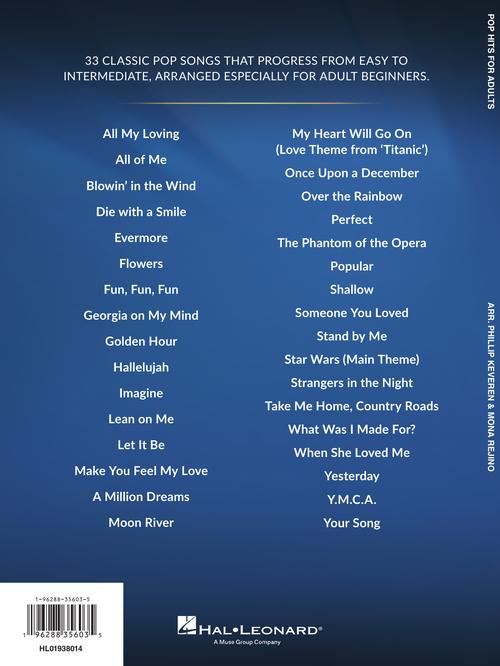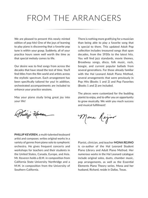 NOTE: For those familiar with the Hal Leonard Adult Piano Method, several popular arrangements that were previously in Pop Hits (Bk 1 and 2) as well as Pop Favorites (Bk 1 and 2) have been included.