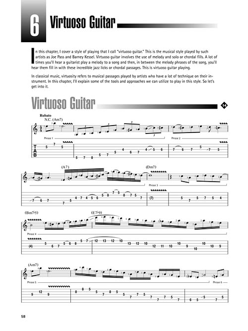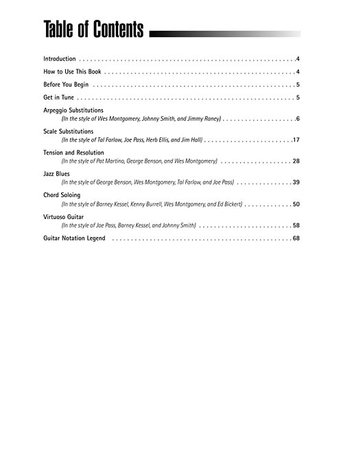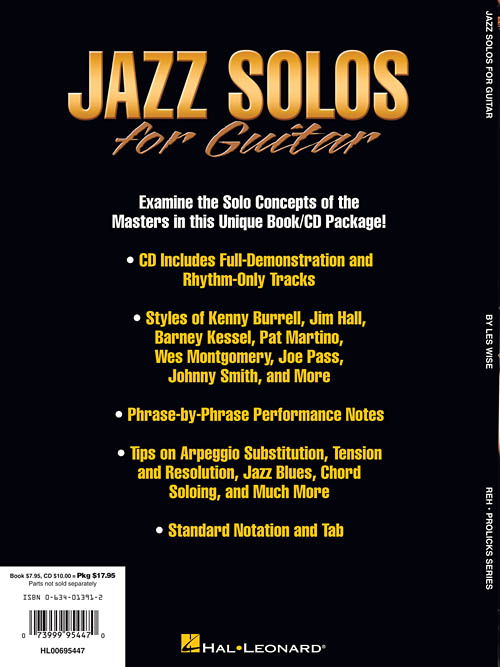 Examine the solo concepts of top jazz guitarists in this info-packed book with online audio. The audio includes full demonstration and rhythm-only tracks to assist with learning the styles of Kenny Burrell, Jim Hall, Barney Kessel, Pat Martino, Wes Montgomery, Joe Pass, Johnny Smith and many others. The book includes phrase-by-phrase performance notes; tips on arpeggio substitution, scale substitution, tension and resolution, jazz-blues, chord soloing and more; and standard notation and tab. The audio is accessed online using the unique code inside each book and can be streamed or downloaded. The audio files include PLAYBACK+, a multi-functional audio player that allows you to slow down audio without changing pitch, set loop points, change keys, and pan left or right.