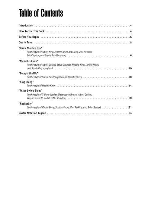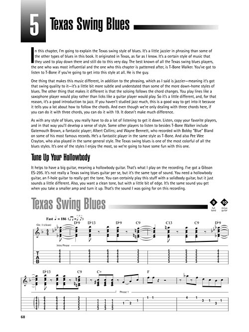 Learn lead guitar in the styles of Albert Collins, Eric Clapton, Albert King, B.B. King, Freddie King, Stevie Ray Vaughan and T-Bone Walker! This unique book/CD pack examines the solo concepts of each of these masters. The CD features full demos and rhythm-only tracks, and the book includes phrase-by-phrase performance notes and tips on bending strings, vibrato, tone, note selection and much more. Includes notes and tablature. A must for any blues guitarist!