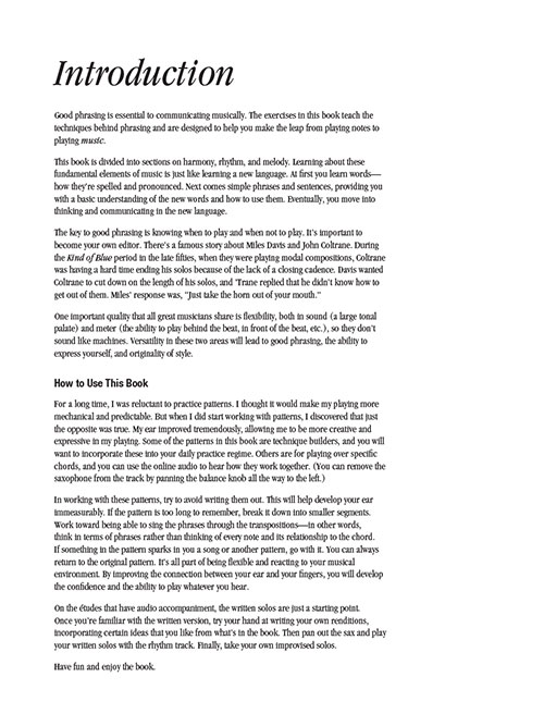 Amazing Phrasing is for any tenor saxophone player interested in learning how to improvise and how to improve their creative phrasing. The ideas are divided into three main sections: Harmony – explores scales, arpeggios, chord substitutions, harmonic embellishments, and other harmonic phrasing ideas; Rhythm – covers legato tonguing, swing feel, rhythmic displacement, how to manipulate time and other aspects of rhythmic phrasing; Melody – discusses contour lines, making patterns musical, developing a motif, building a solo, and many other melodic phrasing ideas. The companion audio includes 26 full-band tracks in various musical styles for listening and play along. The audio is accessed online using the unique code inside each book and can be streamed or downloaded. The audio files include PLAYBACK+, a multi-functional audio player that allows you to slow down audio without changing pitch, set loop points, change keys, and pan left or right.
