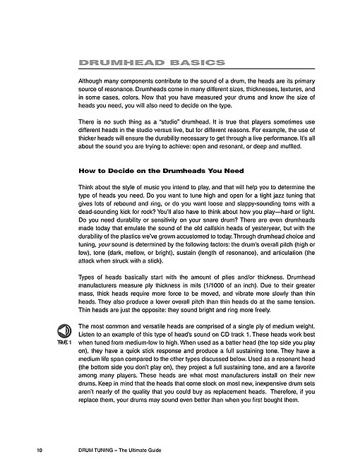 This book/áudio online pack is designed for drummers of all styles and levels, as well as recording engineers and producers. It contains step-by-step instructions along with over 35 professional photos that allow you to see the tools and tuning techniques up close. The 29-track companion áudio online contains demos for listening, so you can read and hear the differences in sounds. Covers: preparation; drumhead basics; drum construction and head properties; tom-toms; snare drum; bass drum; the drum set as one instrument; drum sounds and tuning over the years; when to change heads; and more. Featured in Modern Drummer's 2003 Product Extravaganza!