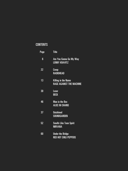 A série Guitar Play-Along vai ajuda-lo a tocar as suas canções favoritas de forma rápida e fácil. Basta seguir a partitura ou a tablatura, ouvir o áudio para sentir como soa o som da guitarra e depois tocar junto utilizando a faixa de play-back. A melodia e a letra também estão escritas caso você queira cantar. As faixas de áudio estão disponíveis online, juntamente com um player digital multifuncional (Playback+), que permite alterar o andamento sem alterar o tom, definir pontos específicos para tocar (loop), alterar o tom, além de balanço direita/esquerda. Incluindo: Are You Gonna Go My Way (Lenny Kravitz) • Creep (Radiohead) • Killing in the Name (Rage Against the Machine) • Loser (Beck) • Man in the Box (Alice in Chains) • Outshined (Soundgarden) • Smells like Teen Spirit (Nirvana) • Under the Bridge (Red Hot Chili Peppers).