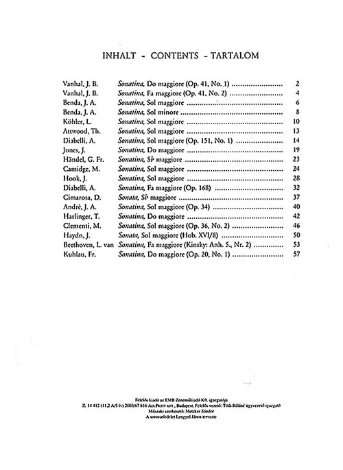 This collection of 19 sonatinas is excellent teaching material for the progressing pianist. The music is generally at a lower intermediate level. Composers represented include Clementi, Köhler, Diabelli, Cimarosa, Beethoven, Haydn, Handel and others.