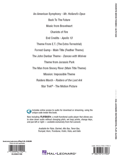 13 sucessos do cinema para sax alto; inclui audio online: Apollo 13 • Braveheart • Chariots of Fire • Dances with Wolves • E.T. • Jurassic Park • Mission: Impossible • Mr. Holland's Opus • Raiders of the Lost Ark • Forrest Gump • e outras!!!