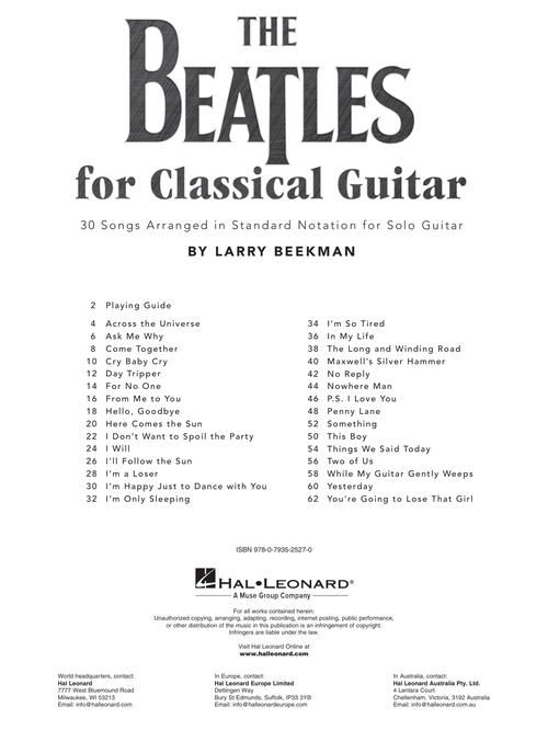More than 25 of the Beatles greatest hits arranged for classical guitar. Contents: Across the Universe • Ask Me Why • Come Together • Cry Baby Cry • Day Tripper • For No One • From Me to You • Hello, Goodbye • Here Comes the Sun • I Don't Want to Spoil the Party • I Will • I'll Follow the Sun • I'm a Loser • I'm Happy Just to Dance with You • I'm Only Sleeping • I'm So Tired • In My Life • The Long and Winding Road • Maxwell's Silver Hammer • No Reply • Nowhere Man • P.S. I Love You • Penny Lane • Something • This Boy • Things We Said Today • Two of Us • While My Guitar Gently Weeps • Yesterday • You're Going to Lose That Girl.