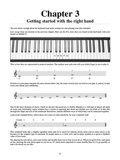 Este é um método de fácil compreensão e mostra o básico da posição das mãos e a postura. Usando este livro até o seu final você estará apto a tocar com as duas mãos, usando combinações de semibreves, mínimas, semínimas e colcheias e suas respectivas pausas. Você estará pronto também para ler partituras tanto em claves de Sol como de Fá, além de tocar alguns acordes básicos.