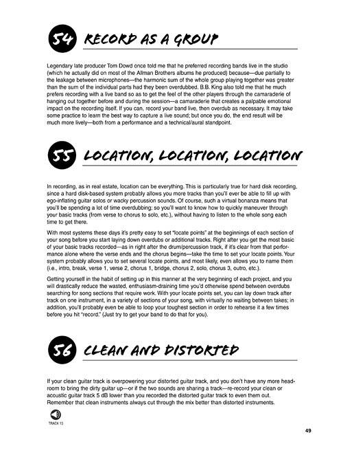 This book contains tips, suggestions, advice, and other useful information garnered through a lifetime of home and pro studio recording adventures. Included in the book are dozens of entries learned firsthand from legendary producers, engineers, and artists such as Tom Dowd, Phil Ramone, Pete Anderson, Dick Shurman, Jeff Beck, Steve Vai, Joe Satriani, Desmond Child, and many more. It's an essential collection of tricks of the trade that will improve anyone's home or pro studio recordings. The accompanying CD includes nearly one hour of audio demonstrations.