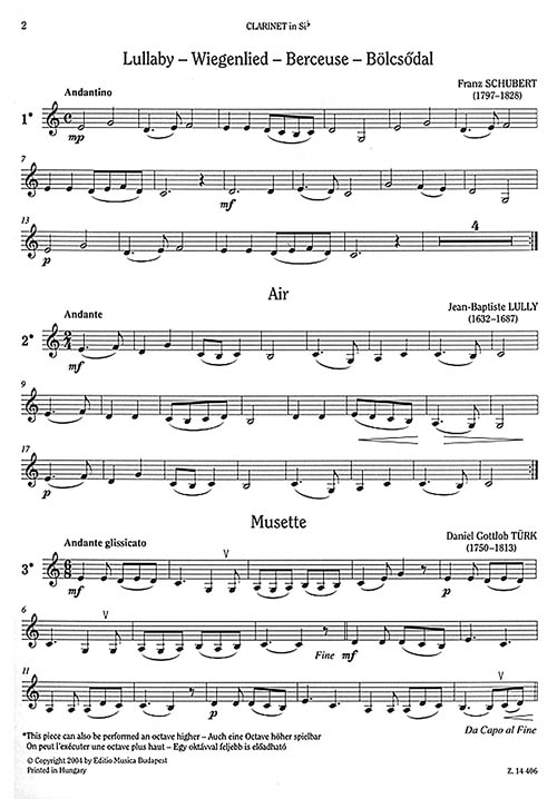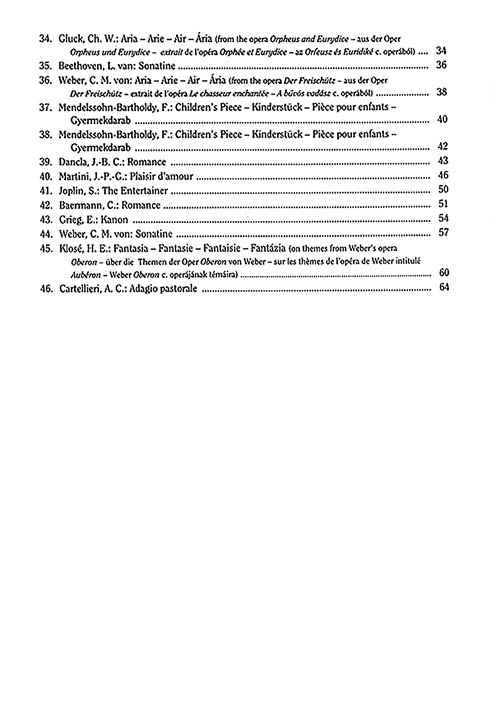 Coleção de 46 peças curtas, de nível intermediário, arranjadas para clarinete e piano. Incluindo amostras dos grandes compositores: Beethoven, Brahms, Grieg, Joplin, Mozart, Rimsky-Korsakov, Schubert, Tchaikovsky, Weber, e outros.