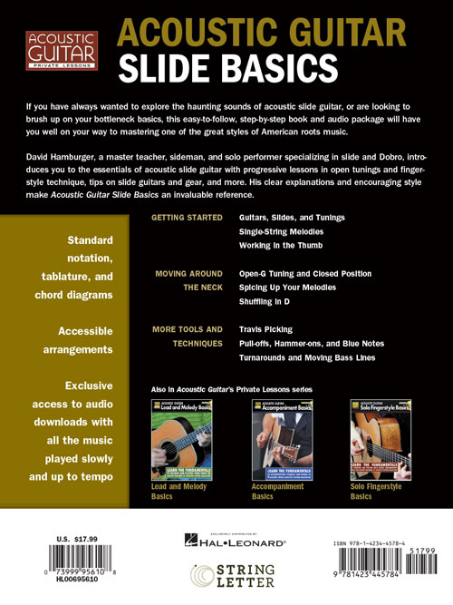 David Hamburger, leading sideman, solo performer and teacher, guides players through this complete introduction to bottleneck slide guitar playing with progressive lessons in open tunings and fingerstyle technique, tips on slide guitars and gear, technical exercises, and full songs. You can access accompanying audio examples online of all of the music played slowly, then up to tempo online. In standard notation with tablature and chord diagrams.