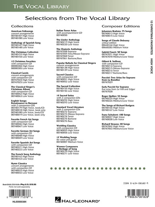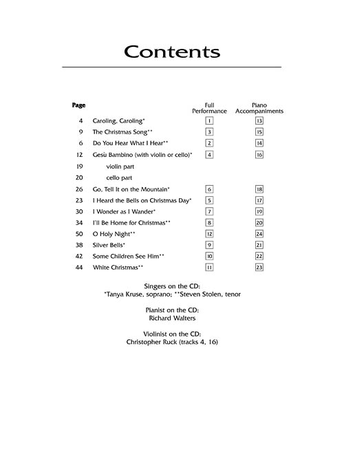 Arranjos para voz e piano com cd de acompanhamento, incluindo: Caroling, Caroling • The Christmas Song • Do You Hear What I Hear • Gesù Bambino • Go, Tell It on the Mountain • I Heard the Bells on Christmas Day • I Wonder as I Wander • I'll Be Home for Christmas • O Holy Night • Silver Bells • Some Children See Him • White Christmas.