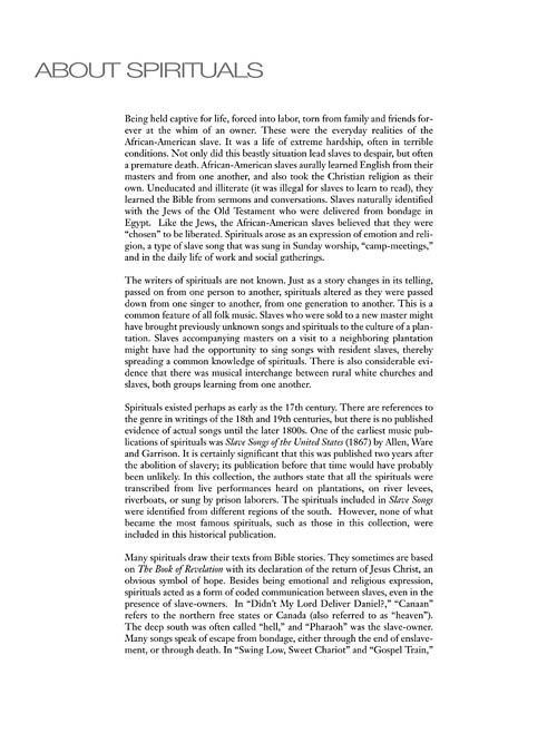 Arranjos facilitados para voz e partes de piano para nível intermediário com Audio Online com faixas de acompanhamento, incluindo: Didn't My Lord Deliver Daniel • Every Time I Feel the Spirit • He's Got the Whole World in His Hands • Let Us Break Bread Together • Steal Away • Were You There? • e outras!