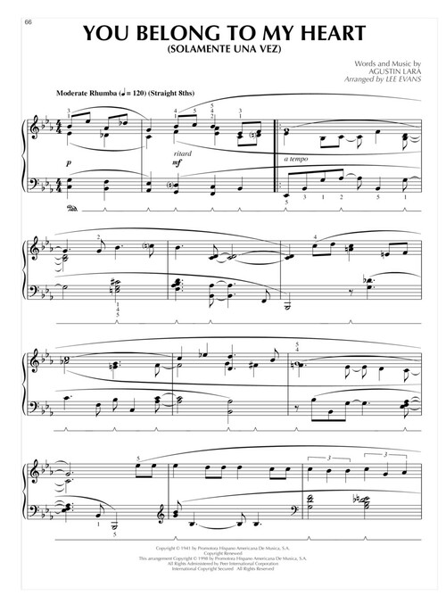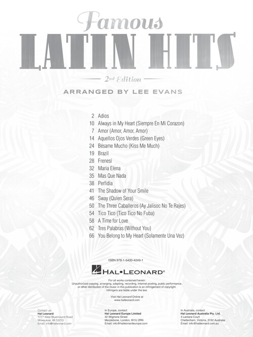 Agora atualizado em uma segunda edição, este songbook apresenta 17 sucessos latinos arranjados por Lee Evans para piano. incluindo: Adios • Always in My Heart (Siempre En Mi Corazon) • Amor (Amor, Amor, Amor) • Aquellos Ojos Verdes (Green Eyes) • Bésame Mucho (Kiss Me Much) • Brazil • Frenesí • Maria Elena • Mas Que Nada • Perfidia • The Shadow of Your Smile • Sway (Quien Sera) • The Three Caballeros (Ay Jalisco No Te Rajes) • Tico Tico (Tico Tico No Fuba) • A Time for Love • Tres Palabras (Without You) • You Belong to My Heart (Solamente Una Vez).