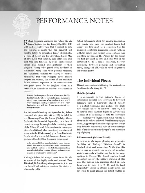 As edições Schirmer são desenvolvidas tanto para estudantes de piano, como para professores e pianistas profissionais. Esta série traz sugestões de interpretação, digitação e comentários históricos e estilísticos. Preparado por professores especializados, este livro é uma importante fonte de pesquisa para todos os pianistas e traz uma coletânea de peças de Robert Schumann. Incluindo: First Loss, Op. 68, No. 16; Humming Song, Op.68 #3;Hunting Song, Op. 68, No. 7 (Jagerliedchen).