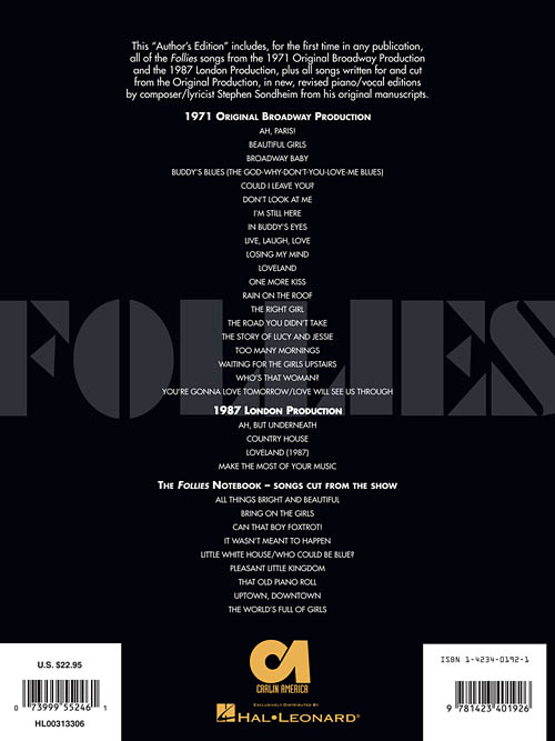 This unprecedented collection contains all of the songs from Follies: from the 1971 Broadway production, the 1987 London revival, and the original production of this beloved Stephen Sondheim musical. Includes 34 songs in all, and a foreword by Sondheim himself! Includes: Ah, but Underneath • Ah, Paris! • All Things Bright and Beautiful • Beautiful Girls • Bring on the Girls • Broadway Baby • Buddy's Blues (The God-Why-Don't-You-Love-Me Blues) • Can That Boy Foxtrot! • Could I Leave You? • Country House (1987) • Don't Look at Me • I'm Still Here • In Buddy's Eyes • It Wasn't Meant to Happen • Little White House/Who Could Be Blue? • Live, Laugh, Love • Losing My Mind • Loveland • Loveland (1987) • Make the Most of Your Music (1987) • One More Kiss • Pleasant Little Kingdom • Rain on the Roof • The Right Girl • The Road You Didn't Take • The Story of Lucy and Jessie • That Old Piano Roll • Too Many Mornings • Uptown, Downtown • Waiting for the Girls Upstairs • Who's That Woman? • The World's Full of Girls • You're Gonna Love Tomorrow/Love Will See Us Through.