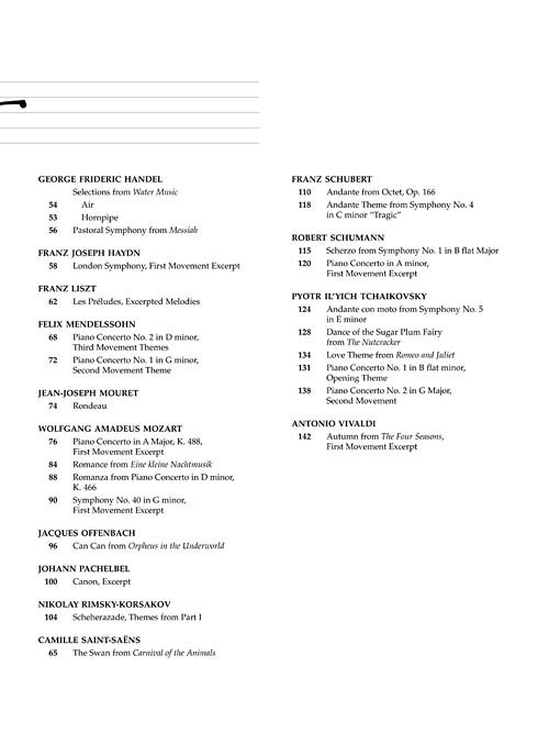 Transcrições para piano solo, incluindo: Canon (Pachelbel), Funeral March of a Marionette (Gounod), Air on the G String (Bach), Romance from Eine kleine Nachtmusik (Mozart), First Movement Theme from Symphony No. 5 (Beethoven), Trumpet Voluntary in D Major (Clarke), First Movement Excerpt from Piano Concerto in A Minor (Schumann), Love Theme from Romeo and Juliet (Tchaikovsky) e outras!