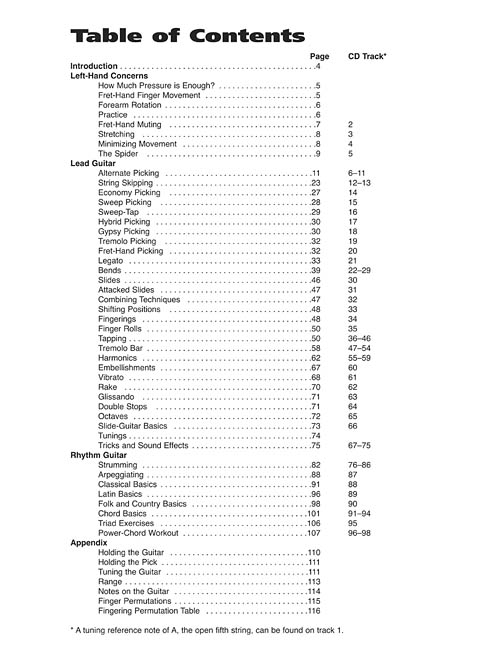 From bends and picking styles to multi-finger tapping and animal sounds, this book with online audio contains loads of guitar techniques to learn and master. Hone your skills with chop-building exercises, and use the demonstration audio tracks to master every technique in the book. Includes: chop-building exercises • tremolo bar, tapping, harmonics • bends, slurs, slides • picking styles, rakes • fret-hand techniques • pick-hand techniques • lead and rhythm guitar • rock, classical, Latin, folk, metal, jazz and more • tricks and sound effects • standard notation and tab. The audio is accessed online using the unique code inside each book and can be streamed or downloaded. The audio files include PLAYBACK+, a multi-functional audio player that allows you to slow down audio without changing pitch, set loop points, change keys, and pan left or right.