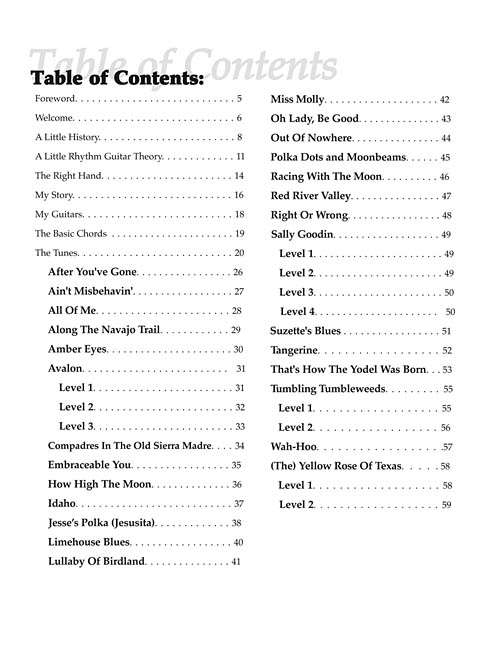 Laying down that solid groove for the rest of the band is a joy! In this book, 26 tunes are transcribed in varying levels of difficulty: a basic rhythm approach for the newcomers, then more adventurous and different approaches. Songs are included from styles spanning western swing, fiddle tunes, ballads, jazz standards and a polka. Playing tips are included for each song, plus you'll learn rhythm history, guitar theory, the right hand, a basic chord chart, and more.