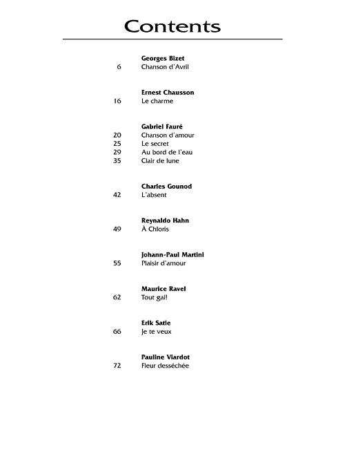 Cada livro desta série vem acompanhado de um CD com o acompanhamento de piano gravado por Laura Ward e informações de pronuncia da língua francesa. Você também poderá utilizar o CD no PC ou MAC para alterar o andamento da música sem alterar o pitch. Inclui as seguintes músicas: Au bord de l'eau (Fauré); Chanson d'Avril (Bizet); Chanson d'amour (Fauré); Clair de lune (Fauré); Fleur desséchée (Viardot); Je te veux (Satie); L'absent (Gounod); Le charme (Chausson); Le secret (Fauré); Plaisir d'amour (Martini); Tout gai! (Ravel) e À Chloris (Hahn).