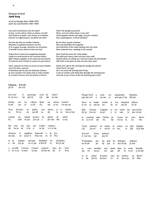 Clean engravings of 12 of the most often sung French art songs are included. Each book comes with a CD with piano accompaniments recorded by Laura Ward, and instructive pronunciation lessons recorded by a native French speaker. The enhanced CD also includes tempo adjustment software for CD-ROM computer use.