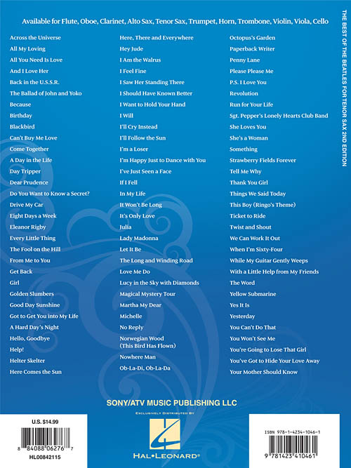 Transcrições para Sax Tenor, incluindo: All You Need Is Love • Eight Days a Week • Eleanor Rigby • A Hard Day's Night • Help! • Here Comes the Sun • Hey Jude • I Want to Hold Your Hand • In My Life • Let It Be • The Long and Winding Road • Revolution • Sgt. Pepper's Lonely Hearts Club Band • Ticket to Ride • Twist and Shout • Yellow Submarine • Yesterday • e outras!