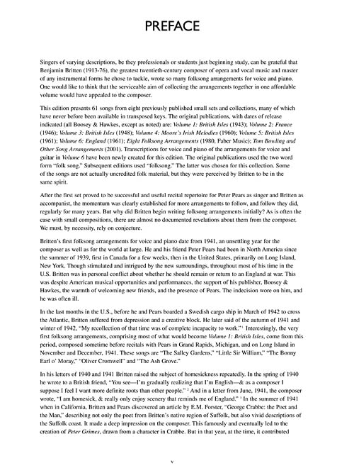 This landmark publication includes 61 songs, combining the contents of the seven published books of Britten folksong arrangements in High and Low Voice editions. Some of the songs have never before been transposed. The songs of Volume 6, for voice and guitar, have been transcribed for voice and piano for this edition.