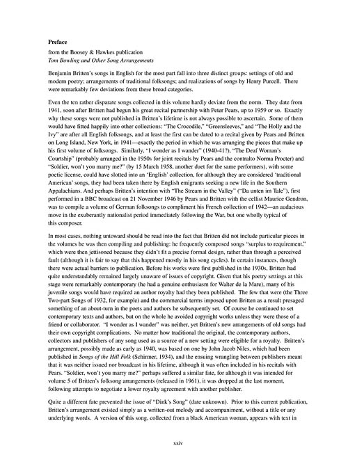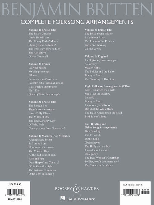 Coletânea com 61 canções incluídas em sete publicações dedicadas a Britten folksong, arranjadas para vozes masculinas e femininas. Diversas destas músicas jamais foram transcritas anteriormente e trazem além das linhas melódicas, as cifras para violão, guitarra e piano. Incluindo: At the mid hour of night; Avenging and bright; Bird Scarer's Song; Bonny at morn (1976); Bonny at morn (volume 6); Ca' the yowes; Come you not from Newcastle?;Greensleeves; How sweet the answer; I was lonely and forlorn; entre outras.