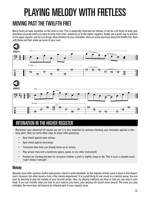 An ideal supplement to any bass method, this book with online audio uses 18 actual songs in various styles to teach key elements of the electric fretless bass, such as intonation; harmonics; keys, scales and intervals; and more. You'll learn to play in the style of Jaco Pastorius, Flea, Jack Bruce, Will Lee, Sting, Gary Willis, Tony Franklin, Jeff Ament and many others via 18 great songs: Bad Love • Continuum • Even Flow • Hocus Pocus • I Could Die for You • Jelly Roll • King of Pain • Kiss of Life • Lady in Red • Tears in Heaven • Very Early • What I Am • White Room • and more. The audio is accessed online using the unique code in each book and features 92 full-band tracks for demo & play-along.