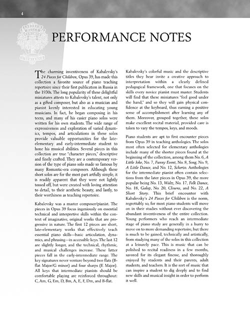 The charming inventiveness of Kabalevsky's 24 Pieces for Children, Opus 39 has made this collection a favorite source of piano teaching repertoire since its first publication in the 1930s. Kabalevsky began composing in his teens, and many of his earlier piano solos were written for his own students. The wide range of expression and exploration of varied dynamics, tempos, and articulations provide valuable opportunities for the late-elementary and early-intermediate student to hone their musical abilities.