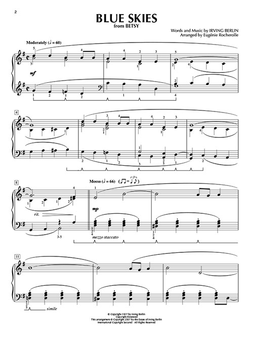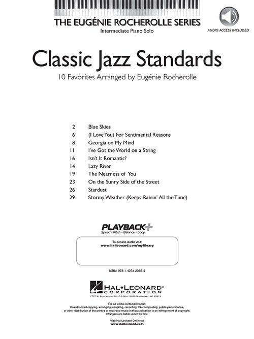 Transcrições para piano solo de nível intermediário. Audio Online com a performance de Eugénie Rocherolle, incluindo: Blue Skies • Georgia on My Mind • Isn't It Romantic? • Lazy River • The Nearness of You • On the Sunny Side of the Street • Stardust • Stormy Weather • e outras!!!