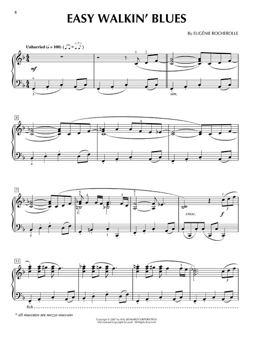 Transcrições para piano solo de nível intermediário. Acompanha CD com a performance de Eugénie Rocherolle, incluindo: Back Street Blues • Big Shot Blues • Easy Walkin' Blues • Hometown Blues • Late Night Blues • Two-Way Blues.