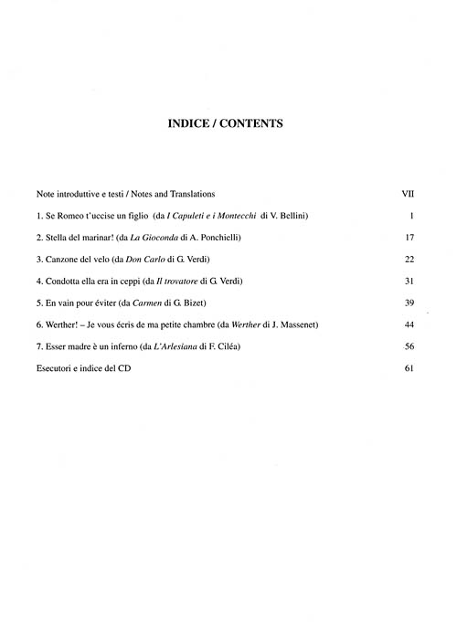 The Cantolopera series offers a new way of approaching the great vocal repertoire. Each volume includes a vocal score and one or more CDs containing, for each number, both a complete version and the respective orchestral accompaniment over which vocalists can practice. Each volume also contains the texts in Italian, English, and the original language when applicable. Comments about context, performers and the Compagnia d'Opera Italiana, with its orchestra of over 130 instrumentalists, are also included.