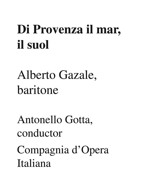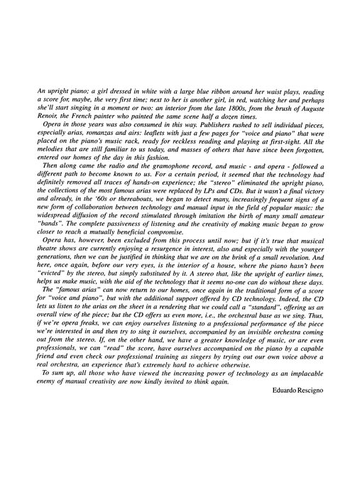 The Cantolopera series offers a new way of approaching the great vocal repertoire. Each volume includes a vocal score and one or more CDs containing, for each number, both a complete version and the respective orchestral accompaniment over which vocalists can practice. Each volume also contains the texts in Italian, English, and the original language when applicable. Comments about context, performers and the Compagnia d'Opera Italiana, with its orchestra of over 130 instrumentalists, are also included.